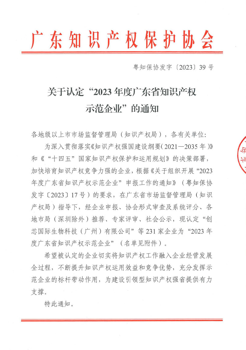 近日,廣東知識產權保護協會公布了2023年度廣東省知識產權示范企業認定結果。此次評選工作經企業申報、協會形式審查、系統評分及所在地市局推薦,并由評審專家組結合總體評定規模、地區平衡等因素進行綜合評審,公司憑借完善的知識產權管理體系、先進的技術創新能力和突出的綜合競爭優勢,被成功評定為“2023年度廣東省知識產權示范企業”。