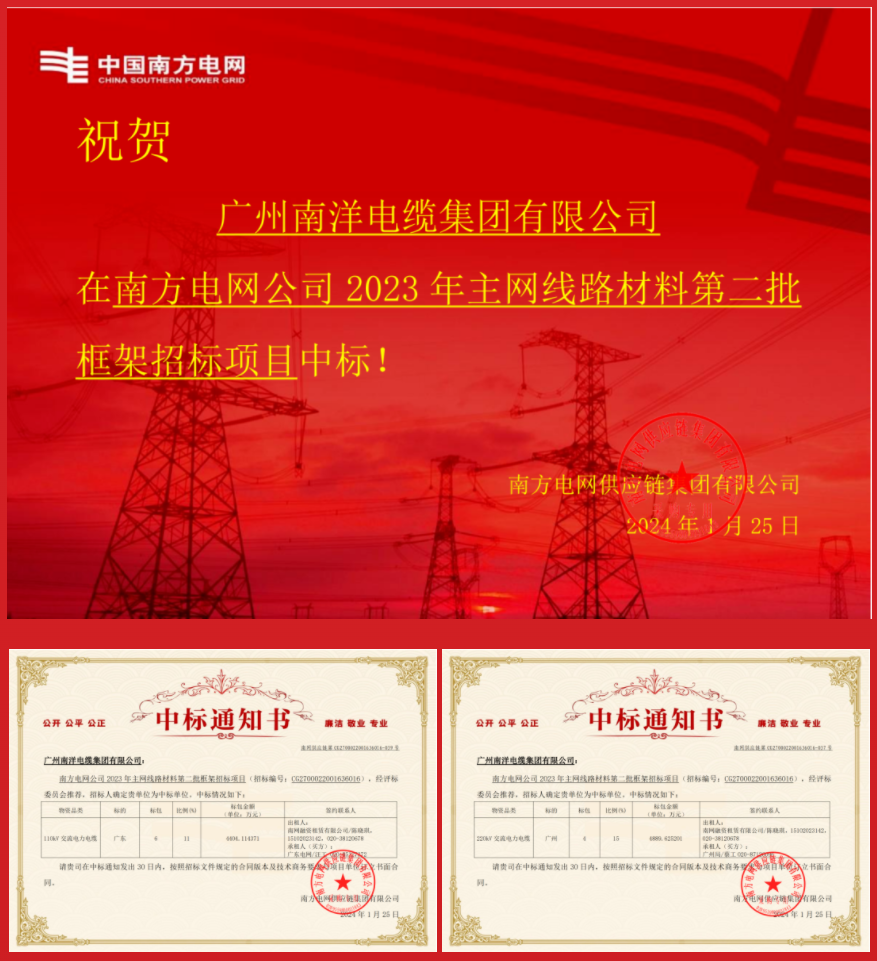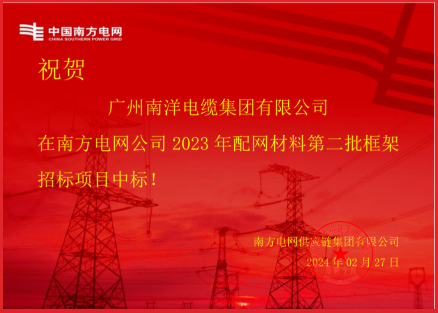 新年伊始,公司喜迎“開門紅”!近期,南方電網(wǎng)公司相繼發(fā)布了2023年主網(wǎng)線路、配網(wǎng)材料第二批框架招標(biāo)項(xiàng)目中標(biāo)通知書,祝賀廣州南洋電纜集團(tuán)有限公司繼續(xù)成為南方電網(wǎng)公司主、配網(wǎng)材料框招項(xiàng)目雙中標(biāo)供應(yīng)商!中標(biāo)金額4.3億元!